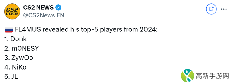 日前GamerLegion战队选手FL4MUS在社交媒体平台上分享了自己的2024年度Top5选手预测: