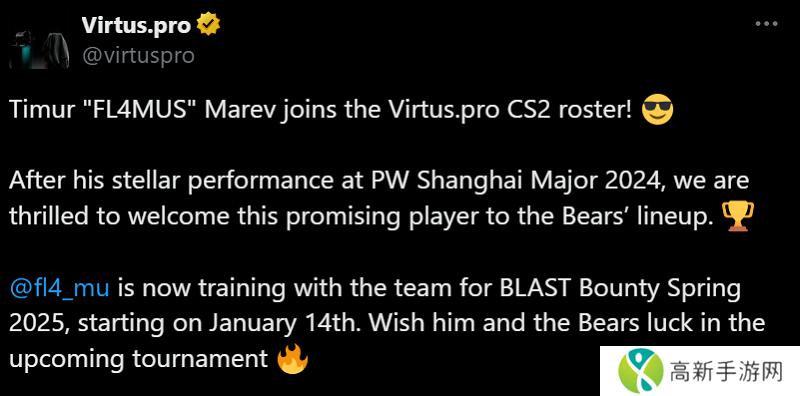 FL4MUS目前正在与团队一起训练,为2025年1月14日开始的春季BLAST赏金赛做准备。祝他和“白熊”在接下来的比赛中好运。”