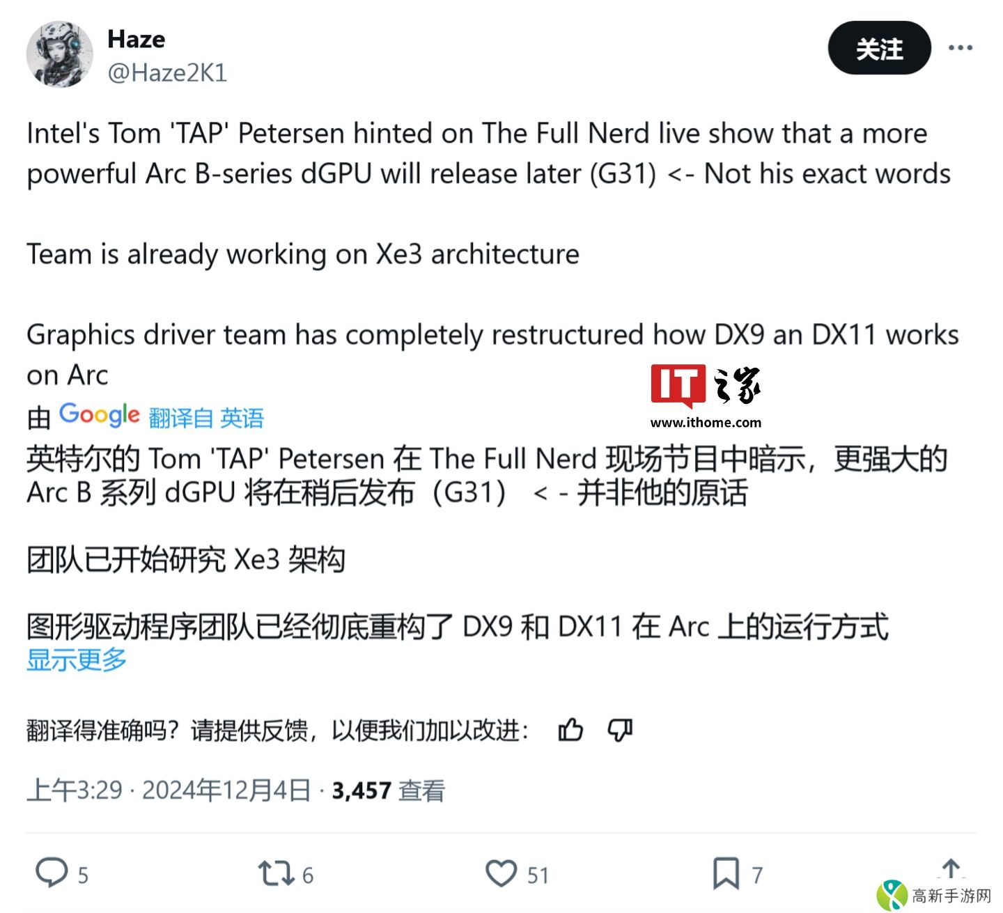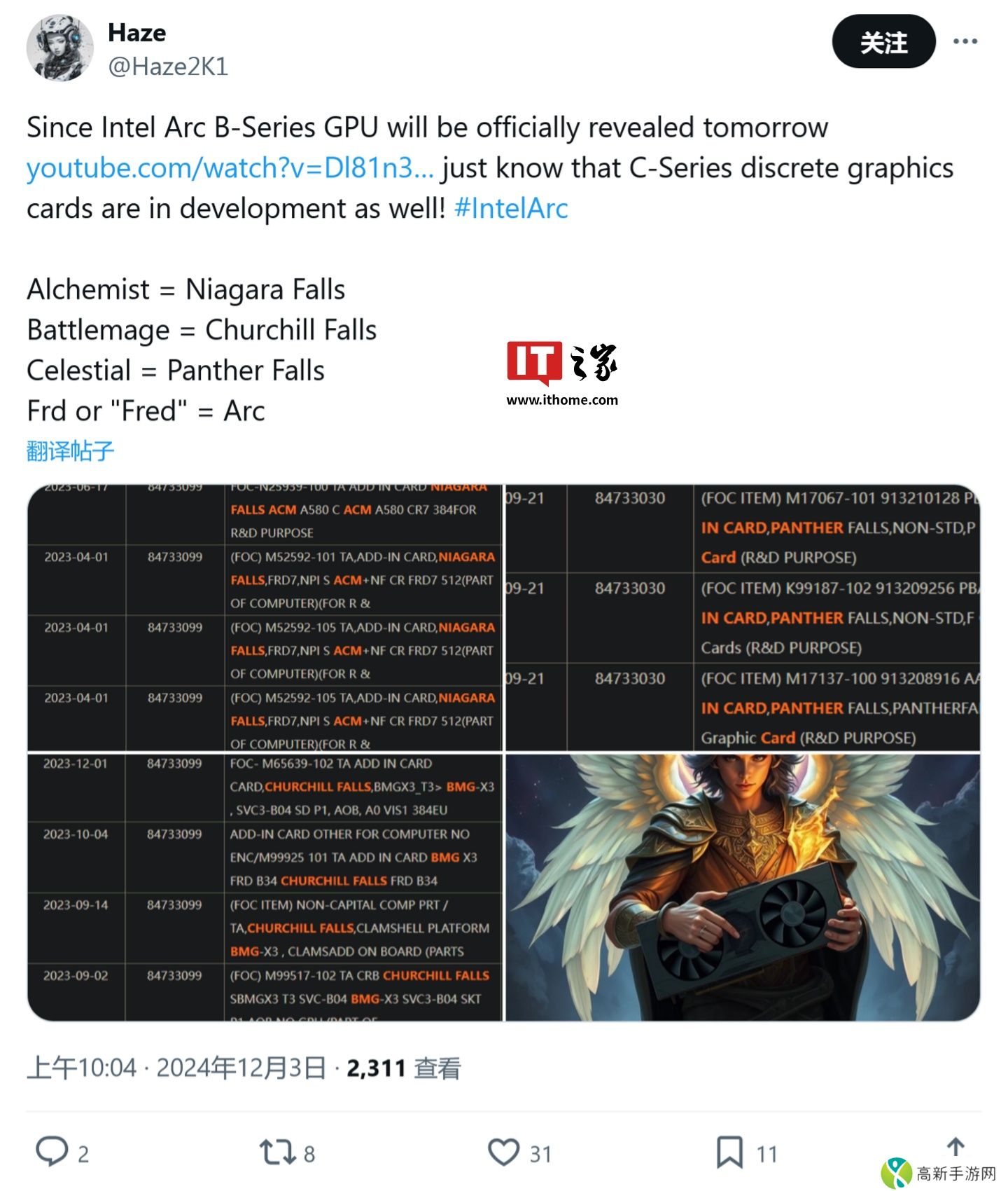 本站 12 月 6 日消息,科技媒体 WccfTech 昨日(12 月 5 日)发布博文,报道称网络上流出了更多关于英特尔下一代 Arc Celestial “Xe3”和更高端的 Battlemage “G31”芯片的证据,打破了此前英特尔将放弃独立显卡业务的传言。