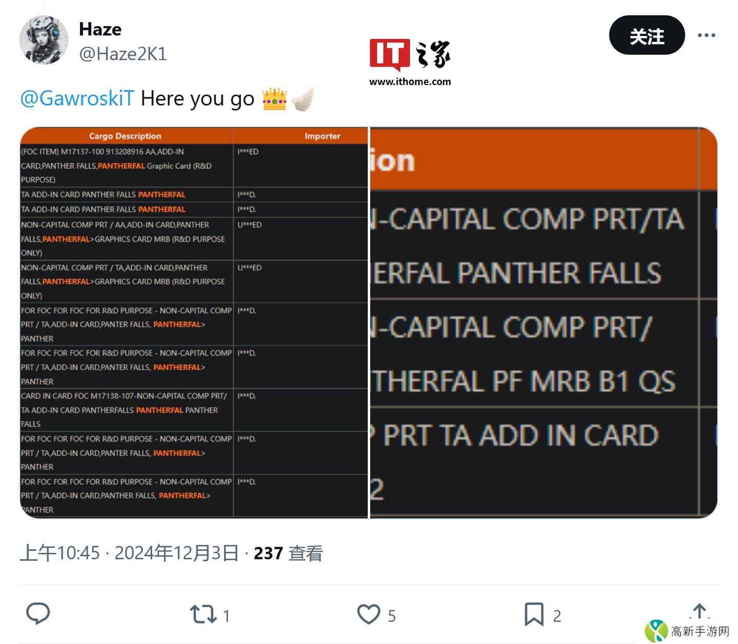 此外在货运清单中,还发现了多款代号为“Panther Falls”的 Arc Celestial 独立显卡,该清单包含多款含 PCB 和完整电路板等部件的合格样品(QS)。