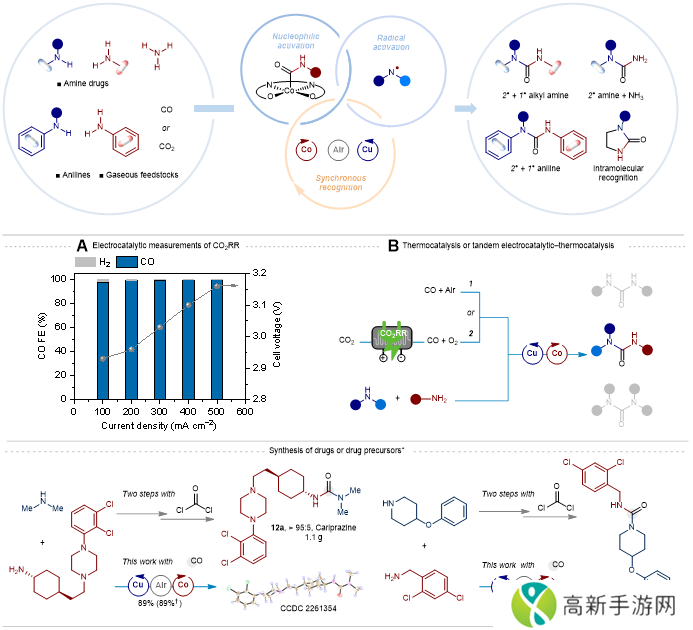 这种全新的羰化模式不仅适用于烷基胺,还适用于各种芳香胺和卤代胺。研究团队还开发了一种电热催化耦合过程,利用电化学方法将 CO2 还原为 CO,然后进行铜 / 钴热催化氧化羰基化反应,生成非对称脲,化学选择性高达 93%。实验表明,接力反应性能与直接采用 CO 路线相当。