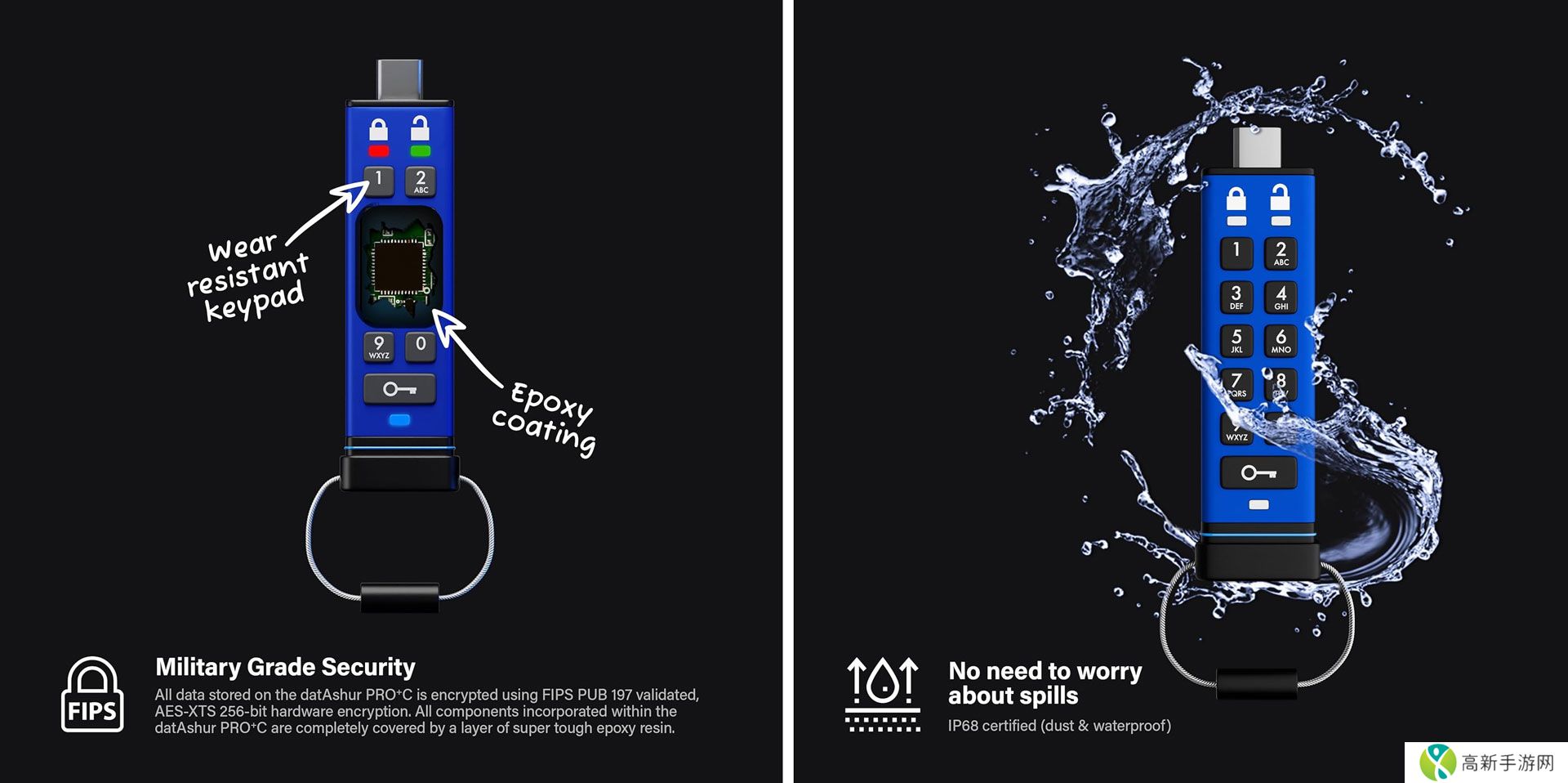 iStorage datAshur PRO+C 加密闪存盘采用了 USB 3.2 Type-C接口,读取速度 310 MB/s,写入速度 246 MB/s,支持 PIN 保护和军用级硬件加密功能,还支持 IP57 级防水防尘。
