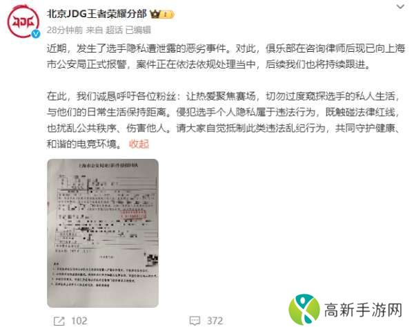 北京JDG发文:最近选手隐私遭泄露的恶劣事件已正式报警