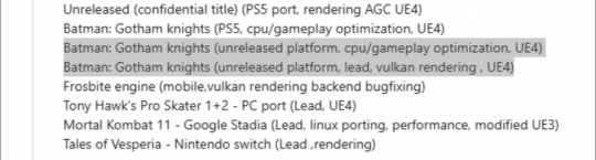 根据油管视频制作者 Doctre 81 发现,一位自称曾参与《哥谭骑士》的开发者在其简历中列出了该游戏即将登陆 2 个未公布的平台。