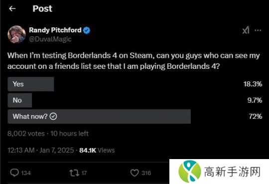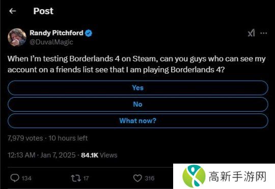 近日Gearbox的首席执行官Randy Pitchford在其个人推特中发布了一则调查问卷推文,并在其中提问:“假如我正在Steam平台上测试《无主之地4》,你们有谁能在好友列表中看到我的帐户信息吗?”