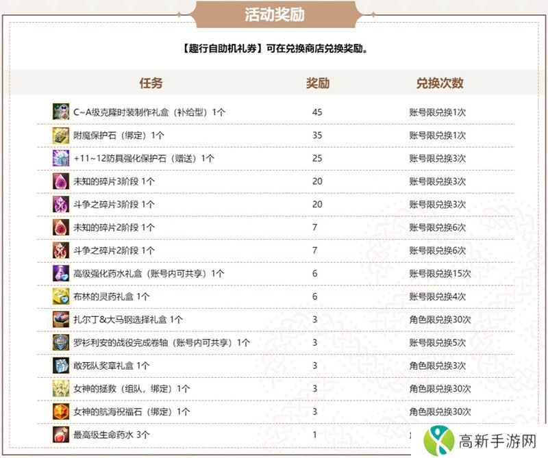 此外,还有能获取多种实用道具的“趣行自助机活动”,在11月12日维护后至12月17日维护前,每周可通过角色邮箱获得20个自助机硬币,使用硬币可兑换任务,完成这些任务就能获得礼券,礼券可以在兑换商店中兑换到C~A级克隆时装制作礼盒(补给型)、附魔保护石等实用道具!