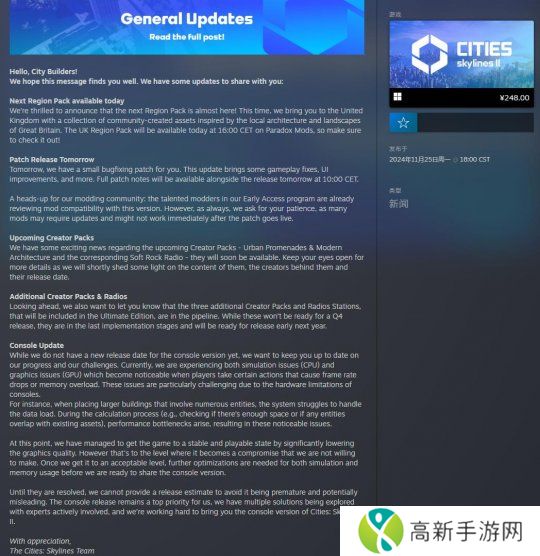 近日开发商Colossal Order在《城市:天际线2》的更新说明中,解释了主机板迟迟未能上线的缘由,官方表示:“目前,我们遇到了模拟问题(CPU)和图形问题(GPU),当玩家采取某些导致帧率下降或内存过载的操作时,这些问题会变得明显。由于游戏机的硬件限制,这些问题尤其具有挑战性。”