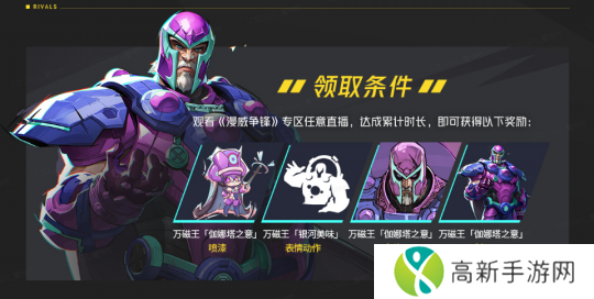 另外,《漫威争锋》还开启了直播掉宝活动,在活动期间(12.6-12.31),观看《漫威争锋》专区任意直播,达成规定时长即可获得万磁王涂鸦、名片、表情动作及【万磁王「伽娜塔之意」制服】等多重梯度奖励。