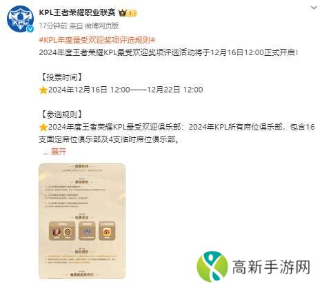 2024年度王者荣耀KPL最受欢迎奖项评选活动将于12月16日12:00正式开启!