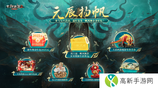 参与元旦活动即有机会赢取珍稀神兽、六艺神兽、超级元气丹/变色丹、一级神兵、一阶仙器、神兵石、终极技能修炼丹等奖励,还有机会获取新年现金红包2025元、周大福一帆风顺款足金祝福小金条2g、珍稀年手办、大话西游2025新年礼盒、孔方车载香薰摆件、龙舞鸡驴手办等新年好礼!