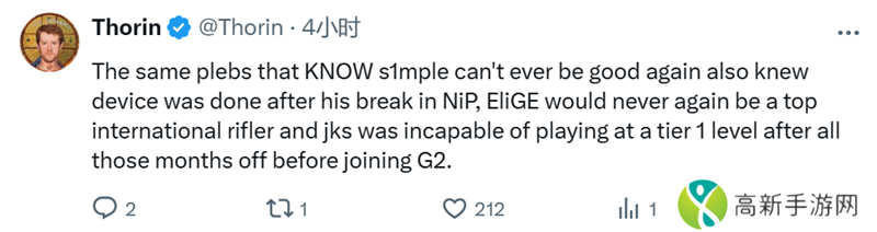 “那些知道s1mple再也无法回归巅峰的人同时也知道,device在NIP休息后就会结束职业生涯了,EliGE再也无法成为世界顶级步枪手了。而jks在经历了加入G2之前的几个月休息期后也无法再打出一线水平了。 ”