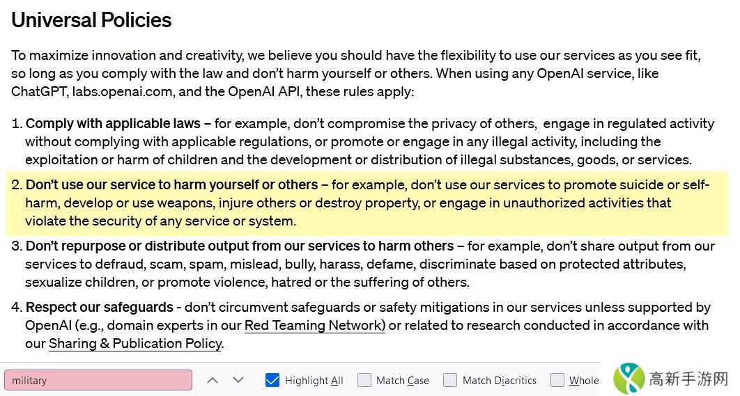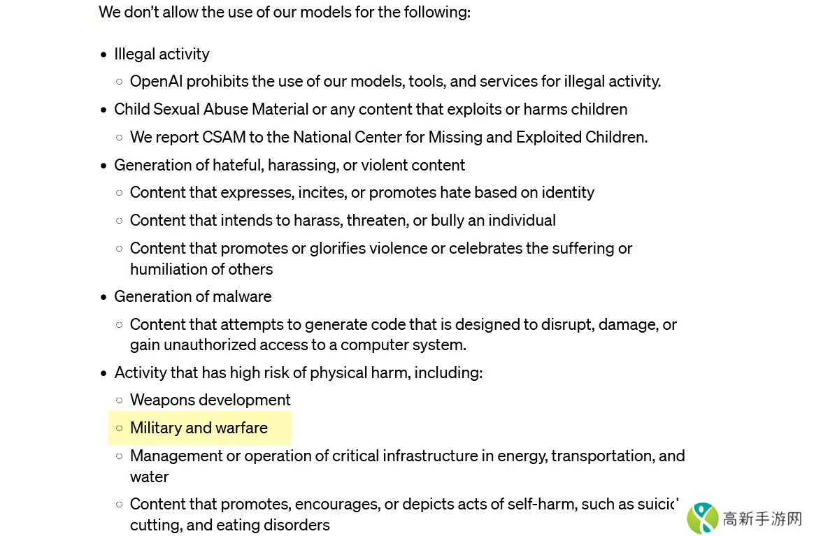 新政策保留了不得“使用其服务伤害自己或他人”的禁令,并以“开发或使用武器”为例,但“军事和战争”这个更全面的禁令已经不复存在。