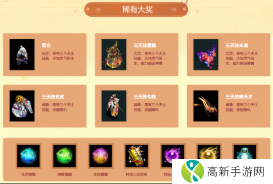 此外,奖池中还包括至尊太极熊、冰夷、海量银元宝、随机元灵、点化羽化完成的六合、神兽+80级相3首饰、机关宠变异·胜遇、六阶坐骑古鹿、80级相4首饰、商城道具等豪华奖励。