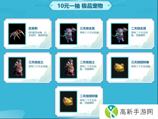 破冰斩霜巨骨刺,福泽满盈招财猪!本月十元一抽活动限时返场的是人气8阶御灵坐骑巨骨刺,三/二天技玄冥、后土、招财猪等极品宠物,更有神兽精魄、变异精魄、特级归元露、特级点化丹等奖励。