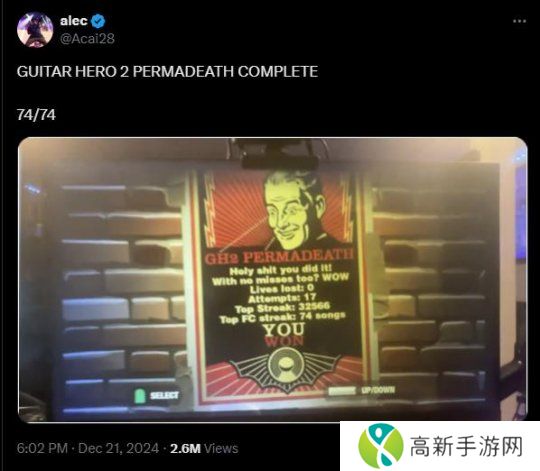 由Harmonix开发的音乐节奏游戏《吉他英雄2》最初于2006年在PS2和Xbox 360平台发售,而在游戏发售了18年后的现今,有玩家达成了完美无错连弹74首歌曲的壮举。