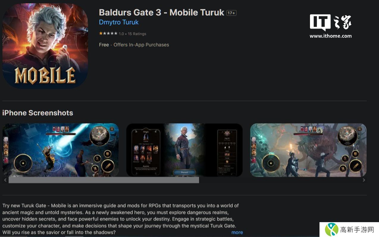 据 VideoGamer 报道,这款假冒应用名为“Baldurs Gate 3 - Mobile Turuk”,开发者标注为“Dmytro Turuk”。应用使用了经过修改的游戏截图,并添加了虚假的移动端操作界面。应用中未提及《博德之门 3》与《龙与地下城》的渊源,也未提到开发商 Larian Studios。