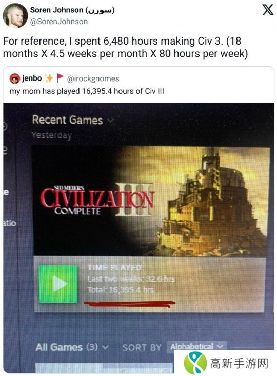 近日推特用户Jenbo分享截图,展示了她母亲在《文明3》上的游戏时长。她透露母亲在这款策略游戏上花费了16395.4小时,相当于自《文明3》发行以来每天进行2.6小时的游戏。