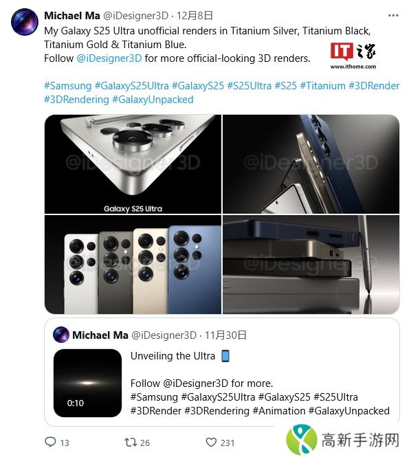 本站注意到,消息源 @iDesigner3D 于 12 月 8日在 X 平台发布推文,分享了三星 Galaxy S25 Ultra 手机的高清渲染图,展示了钛银、钛蓝、钛黑和钛金四种颜色。