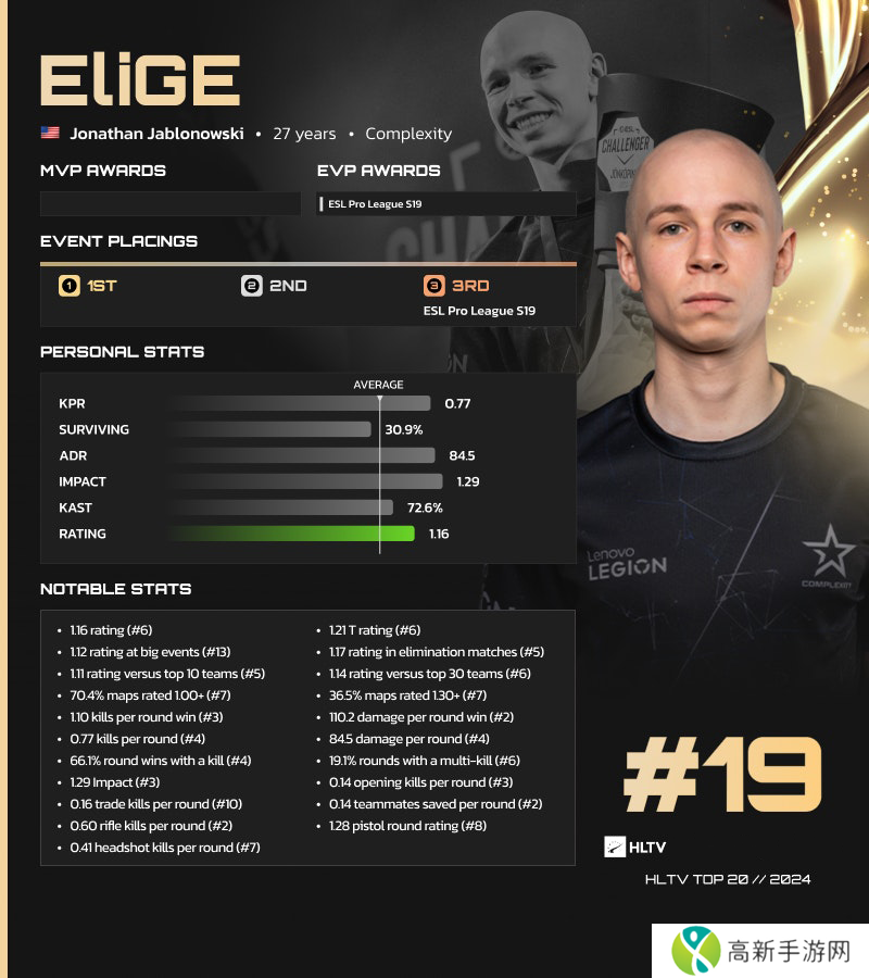 EliGE凭借今年出色的数据表现跻身2024年最佳选手的榜单。他的数据甚至连TOP20中的大多数选手都望尘莫及,例如1.16 Rating(TOP6)、1.12的大赛Rating(TOP13)、0.77 KPR(TOP4)、84.5 ADR(TOP4)、1.09 胜局KPR(1.09)、110.2 ADR(TOP2)。