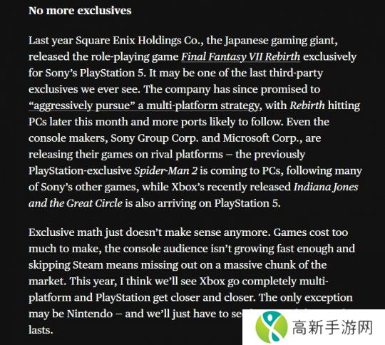 Schreier说:“2025年我们将看到微软全面向多平台发展,而索尼也将逐渐减少独占作品。任天堂在短期内并不会效仿此举措,但这种策略可能不会持续太久,随着开发成本的增加,任天堂可能不得不重新评估其策略。”