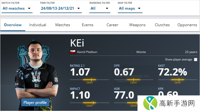 KEi在效力Monte的四个月期间,平均获得了1.07的rating,他与队伍最值得注意的成就是打入了ESL 挑战者 卡托维兹站 2024的半决赛。