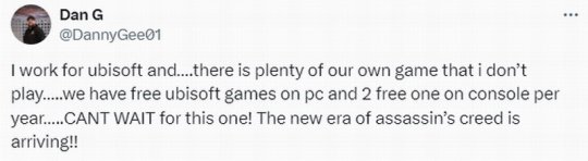 育碧首席动画师Dan G表示,《刺客信条:影》对工作室每个人来说都是一件大事,他打算玩玩这款游戏。他还发布了大胆声明:“《刺客信条》的新纪元即将到来!”