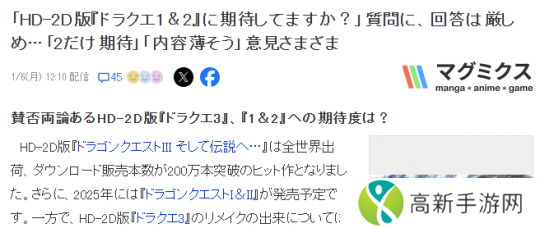 今日《勇者斗恶龙3》的HD-2D重制版发售,虽然有吐槽的声音,不过整体还是好评热卖,日前有日媒发布玩家调查,预定2025年推出HD-2D版前两部重制期待度,1代并没有人气。
