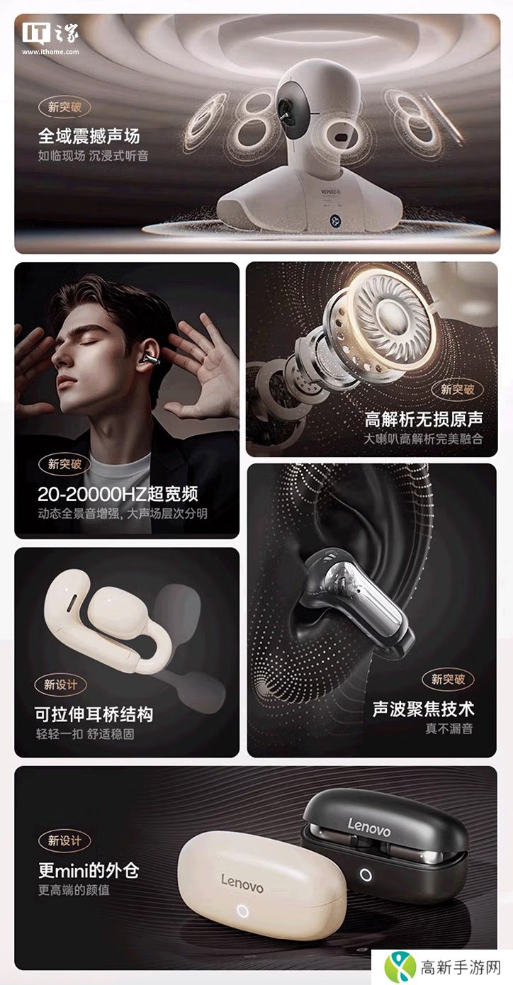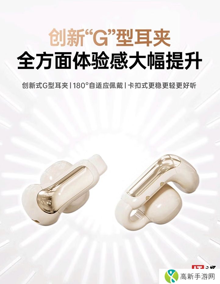 这款耳机采用 G 型耳夹设计,号称拥有沉浸式全景音声场,耳桥结构支持拉伸,可贴合耳形降低漏音。