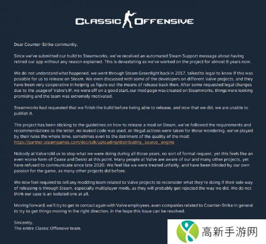 近期,知名《CSGO》mod开发团队Classic Offective对外宣布,制作团队制作d 《经典攻势》mod被叫停。据mod的开发团队负责人称:“ Valve在没有任何解释的情况下禁用了我们的应用程序。这是毁灭性的,因为我们已经在这个项目上工作了近八年了。”
