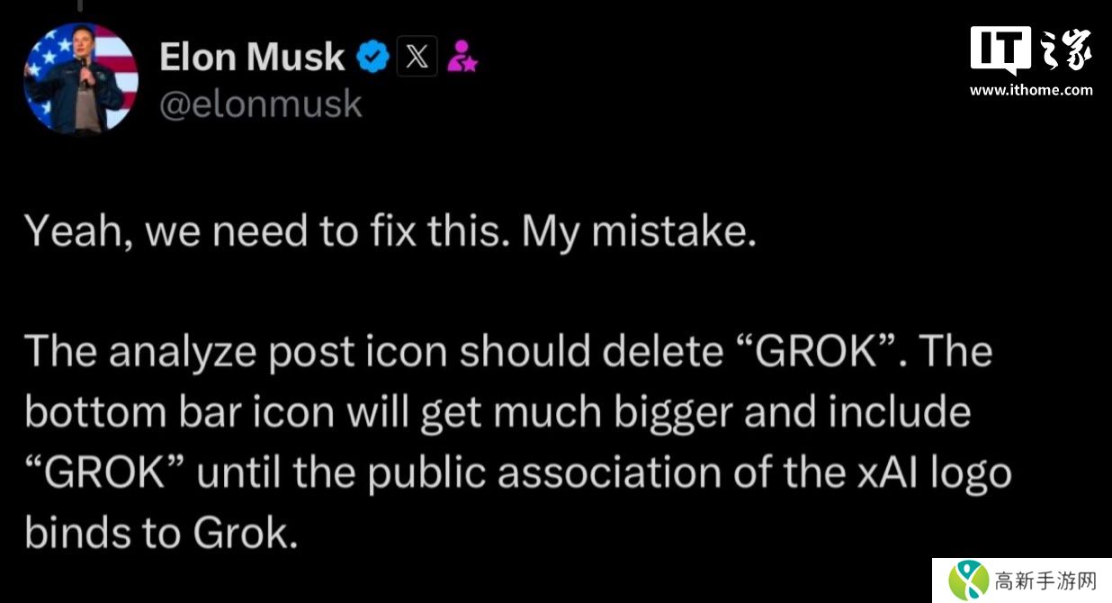 马斯克在社交媒体上直言,此前 xAI 与 Grok 各自独立 Logo 的策略是“他的失误”。他表示,启用与 xAI 统一风格的 Grok 新 Logo 后,“分析帖子”图标中将不再包含“Grok”字样,而 X 客户端底部栏中的 Grok 图标将变得更大,并重新加入“Grok”的标识文字。马斯克认为这能通过更突出的视觉呈现,加速 xAI 标志与 Grok 在公共形象上的绑定。