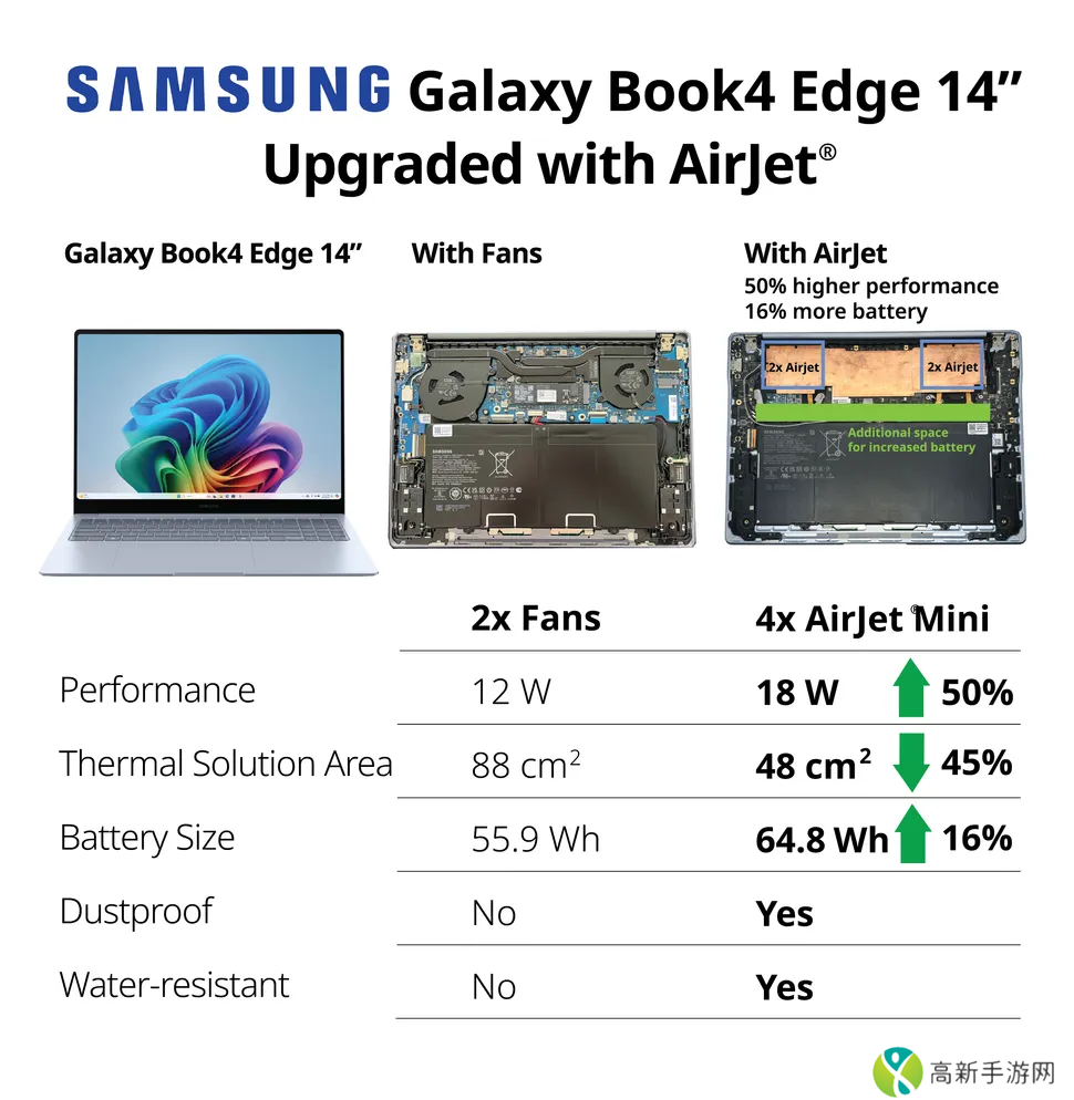 这一改变减少了 45% 的散热系统占用空间,释放了内部空间,从而将电池容量从 55.9Wh 增加到 64.8Wh,使视频播放时间延长 16%,从 20 小时提高到 23.2 小时。AirJet 系统还无需风扇进气孔,从而实现了更时尚、防尘和防水的设计,同时保持了 10.9 毫米的超薄机身。与 MacBook Air 15 相比,搭载 AirJet 的 Galaxy Book4 Edge 14 提供了更卓越的性能和电池续航,持续功率高出 50%,视频播放时间长 29%。