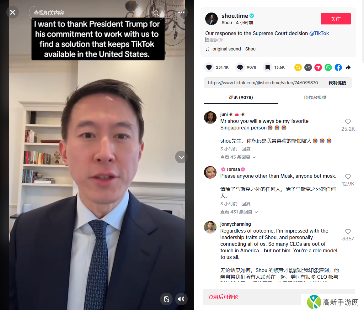 本站 1 月 18 日消息,四个小时前,TikTok 首席执行官周受资通过 TikTok 发布了一条视频,称其将尽全力确保 TikTok 平台未来继续繁荣。