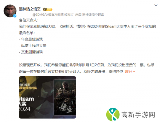 这波真不好输 Steam大奖投票开启 游科为《黑神话》拉票