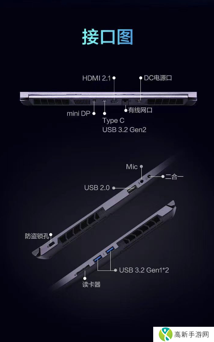 接口方面,该机右侧配备2个 USB-A 3.2 Gen 1接口、1个 SD 读卡器;左侧配备1个 USB-A 2.0接口、2个3.5mm音频接口;后侧配备1个 USB-C 3.2 Gen 2 接口、1 个 Mini DP 接口、1个 HDMI 2.1接口、1个 RJ45 接口。