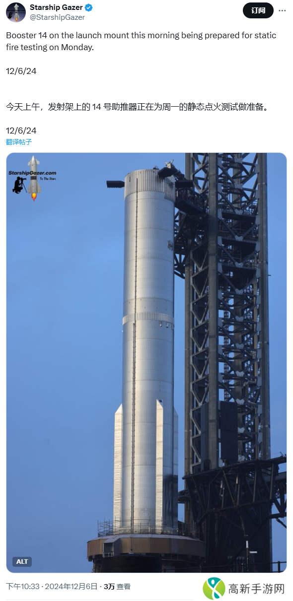 SpaceX 星舰(Starship)第七次飞行试验任务将使用的 Booster 14 超重型助推器已经竖上发射台,为下周一的静态点火测试做好准备。
