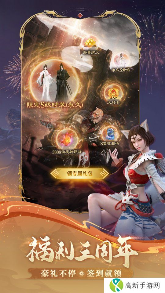 作为三周年的重头戏,福利豪礼当然够多够满,拿到手软!除了空前力度送出永久时装、永久背饰、永久坐骑、限定头饰等牌面限定外观外,更有大月卡通天令、3888仙魔转职符、S级英魂整卡和海量道具,帮你精炼、魂石、镌刻轻松无忧,轻松过门槛,畅享完美大陆精彩体验。除此之外,周年福利更可和新服活动与签到活动叠加!当年人人称羡的金毛狮王和拉风橙装签到即领,魂石、天书、精灵、坐骑、时装,共有价值超3W+绑元的顶级礼包无门槛领取,保送战力提升,轻松体验游戏全部核心玩法!