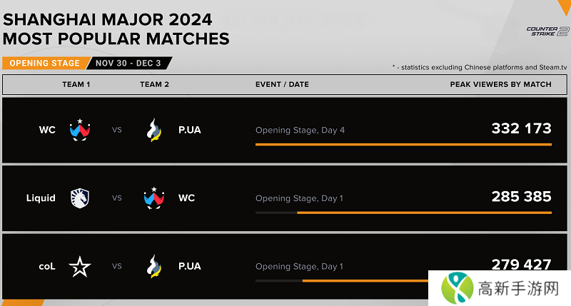Passion UA,最高同时在线观众人数超过32.5万。总体而言,比起2024哥本哈根Major,中国观众数量较少,但淘汰赛阶段的情况可能会有所改变。