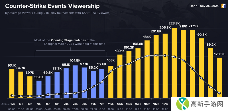 柱状图蓝**域为上海Major开幕赛阶段的比赛时间和24小时内平均观看人数(仅统计观众人数超10万的CS赛事)