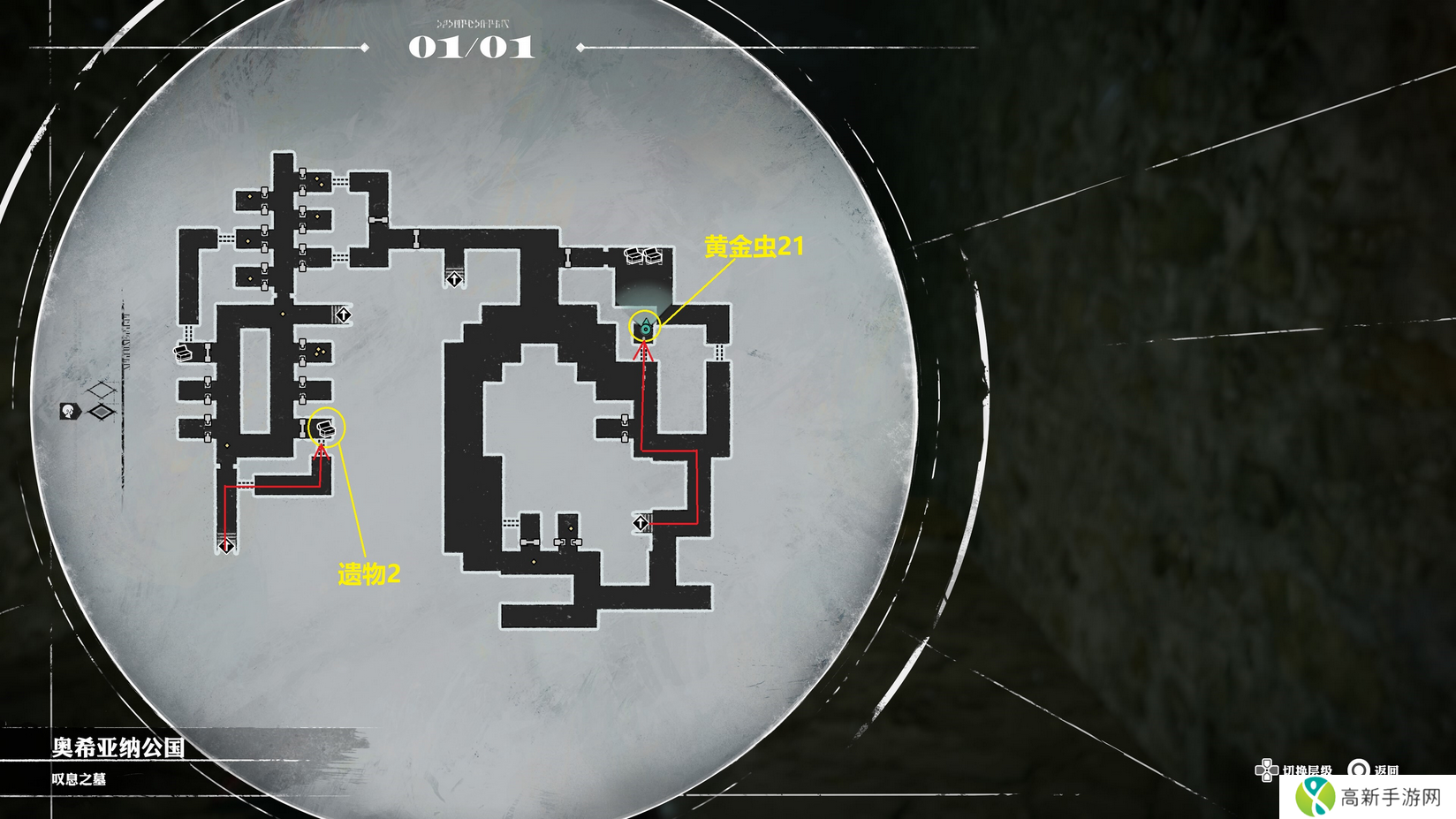 下层东北方的两个宝箱,右侧楼梯下来后,往右走钻洞到达,右侧楼梯下来后,按照红线走,获得黄金虫21。