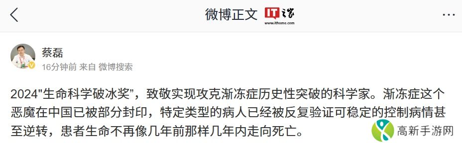 本站注意到,蔡磊本人今日也在微博发文称,“渐冻症这个恶魔在中国已被部分封印,特定类型的病人已经被反复验证可稳定的控制病情甚至逆转,患者生命不再像几年前那样几年内走向死亡。”