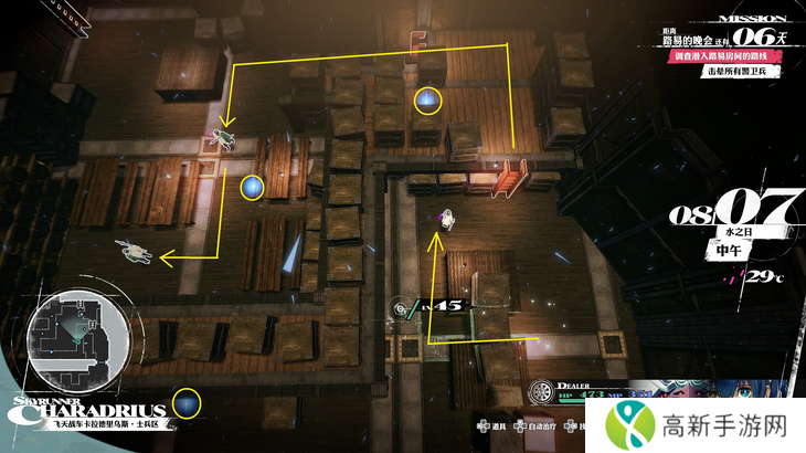 来到士兵休息区,先往前走上梯子,里面有个蓝色光点是武器,然后找全部能对话的士兵对话,主角选自己潜入。士兵区域潜行路线如图,第二个士兵要等他从北向南走的时候再去打晕,全打晕后别忘了捡光点,如果没捡打完中士出来还能捡。