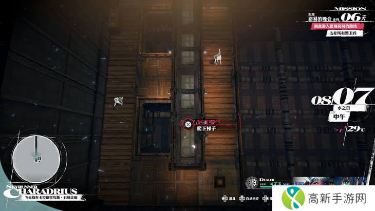 霍肯伯格吸引注意,等右侧士兵由南向北走时候下梯子打晕,接着按照黄线打晕左边士兵。