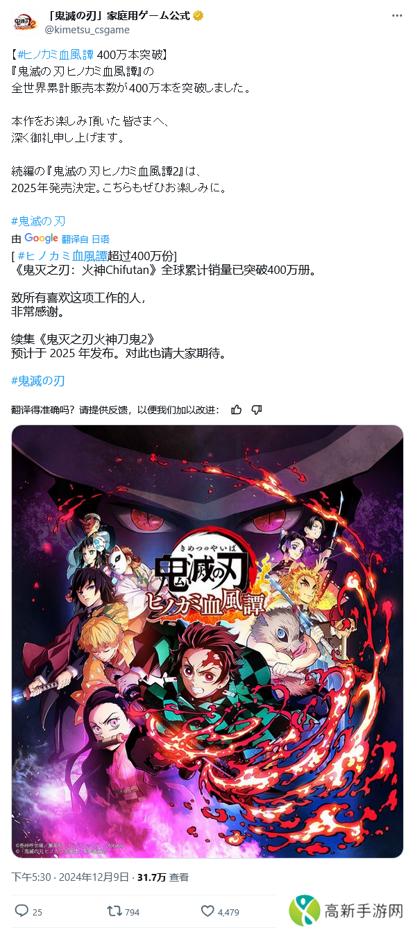 《鬼灭之刃火之神血风谭》销量突破 400万