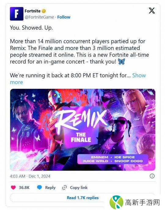 游戏最近举办了 Remix:The Finale 音乐活动,这是一场由史努比狗狗、艾米纳姆、Ice Spice以及已故的Juice Wrld主演的游戏内音乐会,规模非常庞大。Epic Games在推特上透露,在活动期间,《堡垒之夜》的同时在线玩家人数峰值超过了1400万,这是《堡垒之夜》在游戏内音乐会期间同时在线玩家的新纪录。除了游戏内的同时在线玩家外,该活动还通过网络吸引了超过300万观众进行观看。