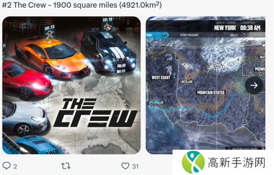 有玩家统计了地图最大的一些游戏,有很多玩家耳熟能详的作品,你能猜到哪一个最大吗?8 《正当防卫4》,1023平方公里7 《飙酷车神》,4921平方公里6 《上古卷轴2》,22万9580平方公里(开发者
