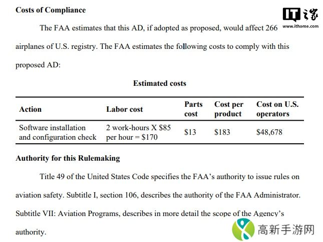 本站注意到,美国联邦航空管理局预计将影响 266 架在美国注册的波音飞机,预估遵守该指令的成本如下: