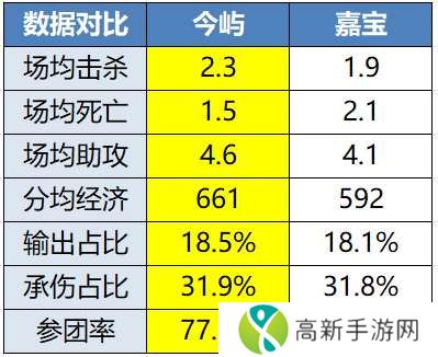 而今屿今晚的对手嘉宝,在小组赛的表现也同样谈不上亮眼,KDA在淘汰赛打野选手里排名倒数第二,参团率也同样是末流。英雄池方面,嘉宝坦野的胜率要明显优于野核,夏侯惇5战3胜,阿古朵2战全胜。至于镜和大司命,一个50%胜率场均1-1.5,一个3战仅1胜。在今晚的BO7里,对嘉宝的英雄池无疑是个巨大的考验。