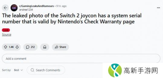 从图中可以明显的看到Switch 2的Joy-Con手柄与初代NS的手柄布局十分相似,只不过不过具有更大的“SL”和“SR”肩键,以及为了适配磁吸插槽的侧边突出条(有别于初代NS的滑轨设计)。虽然“秋天的干”只展示了左手柄的侧面和背面,并未提供该Joy-Con手柄的正面,但从侧边可以基本看到该手柄的完整编号,reddit上已有玩家尝试验证并表示该保修有效。