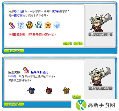 每日任务奖励接力箱,选择想要领取的道具种类,可以决定要领取哪种颜色的接力箱,每种接力箱可获得所选道具的数量不同。