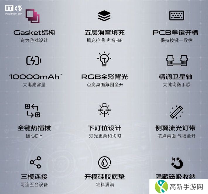 系列键盘使用 101键三模配列,采用Gasket结构,使用下灯位设计,键盘配备侧翼流光灯带,同时配有按压式 2.4GHz接收器收纳仓,可选5000/10000毫安时电池版本。